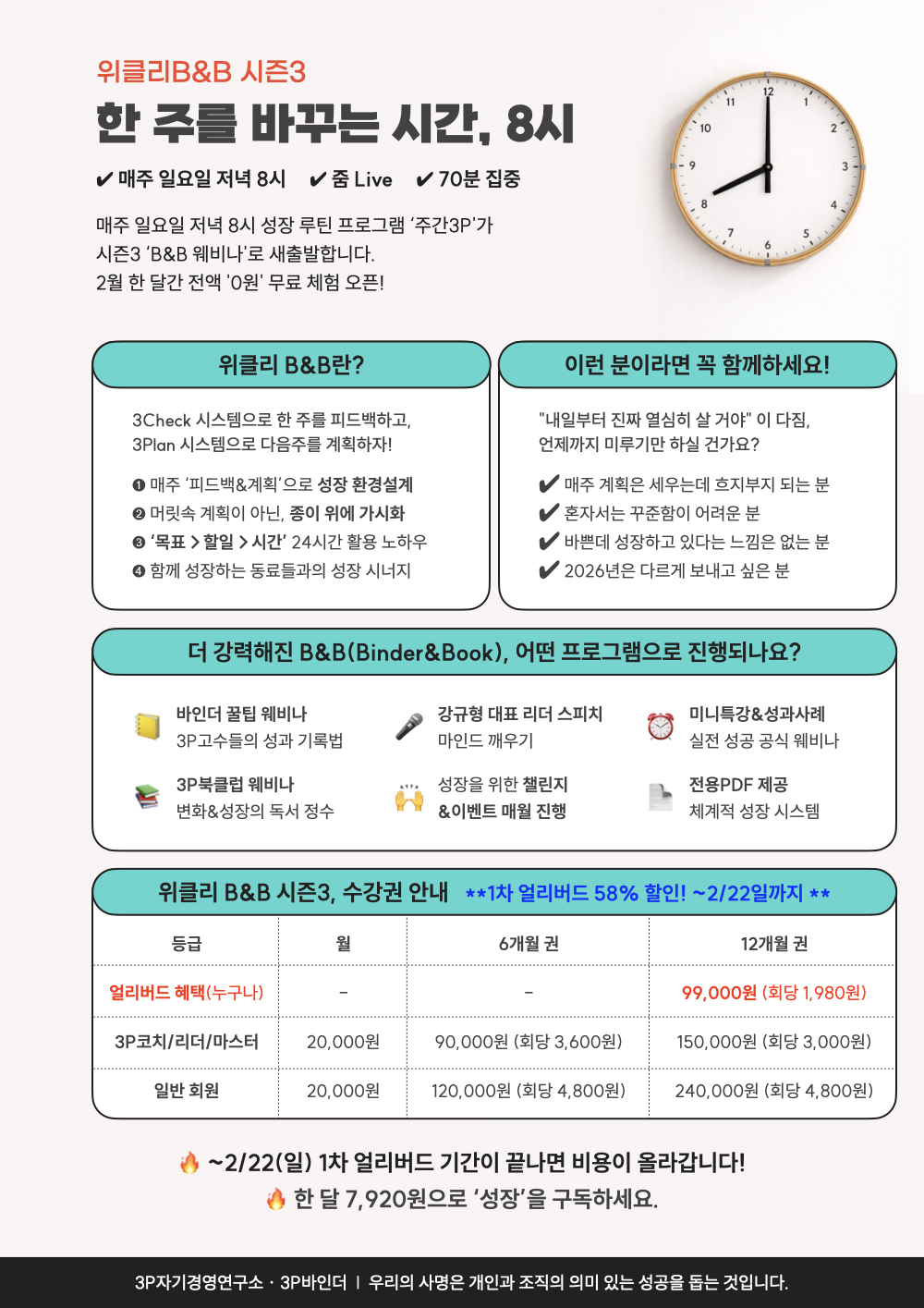 일요일 저녁 8시: 한 주 피드백 및 다음 주 준비 ✔️ 추천시간 : 3P와 함께하는 저녁 8시, 위클리B&B